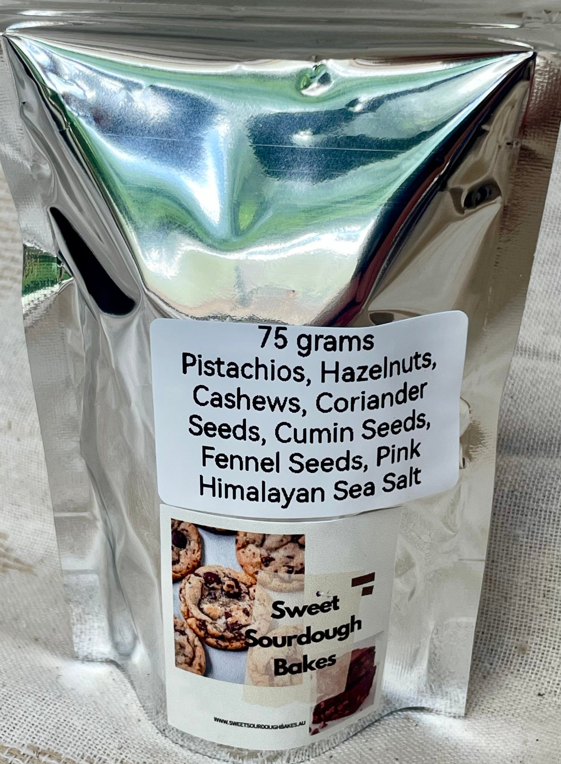 We make our Dukkah by roasting pistachio nuts, hazelnuts, cashew nuts, cumin seeds, coriander seeds, fennel seeds & pink Himalayan sea salt.